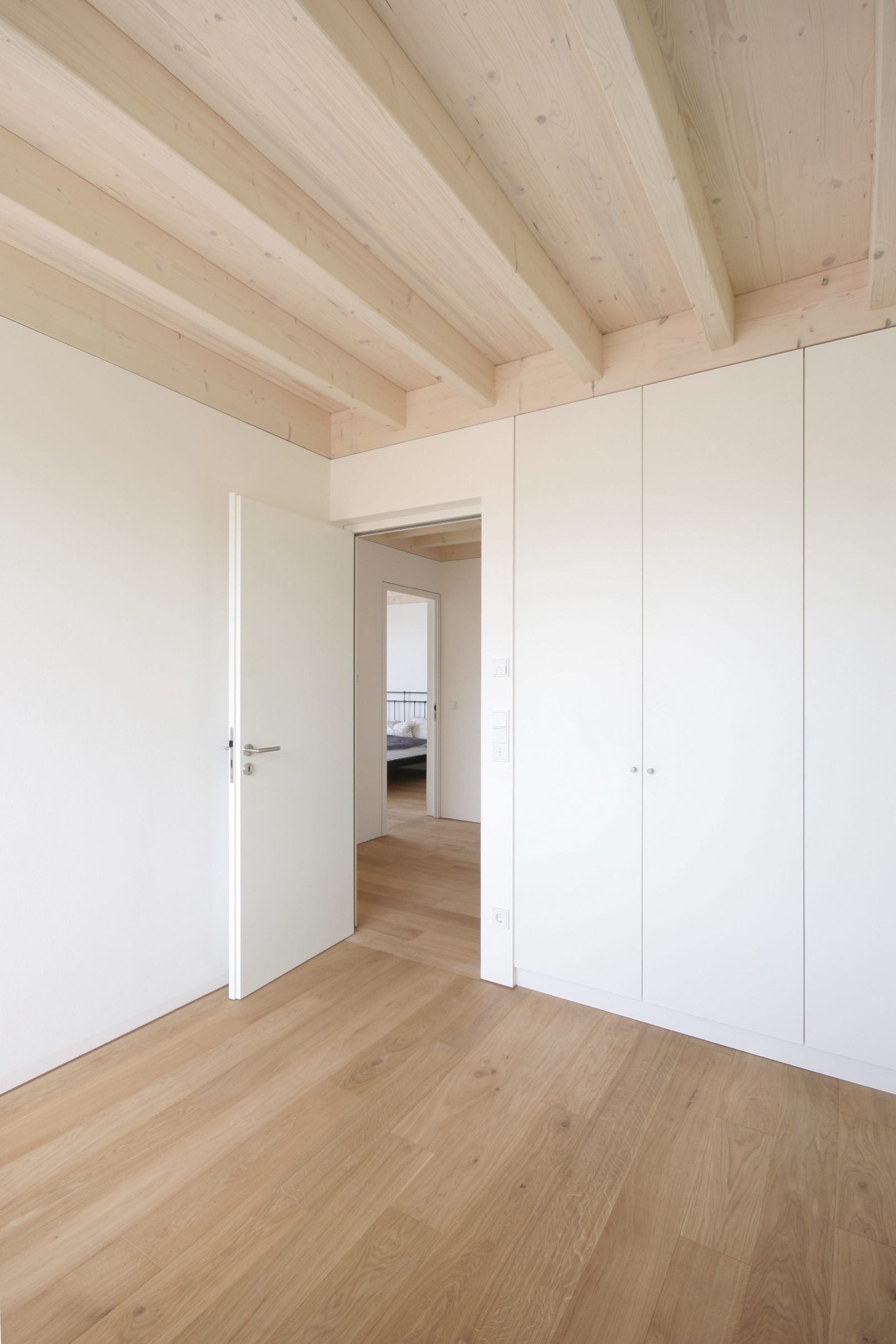 das einfamilienhaus befindet sich am südlichen rand des neubaugebietes sebastianswiese im norden der kreisstadt mindelheim. durch seine setzung und seine morphologie reagiert das haus auf die gegebenheiten vor ort. der präzise bebauungsplan bestimmt die äussere form, die geschossigkeit und die erschliessung. das volumen optimiert durch seine implantation das grundstück so, dass ein maximum an privatheit und grosszügigkeit im südlichen und westlichen garten erreicht wird. die typologie des hauses entspricht dem lebensstil einer vierköpfigen familie, deren schlafräume sich im obergeschoss befinden, über einem erdgeschoss, dass dem wohnen gewidmet ist. der essraum erstreckt sich über beide geschosse und bildet so das herz des hauses. das wohnzimmer findet seine erweiterung in einem zusätzlichen raum für gäste oder bibliothek, was eine flexible und polyvalente nutzung erlaubt. die stauflächen, kücheneinrichtungen wie backofen und kühlschrank, sowie der kamin sind in die wände integriert. dieses konzept optimiert die hauptnutzflächen in einen kompakten grundriss, gewährleistet jedoch eine überraschende grosszügigkeit durch die zweigeschossigkeit des essraums. die fensteröffnungen sind so gesetzt, dass sie je nach dem privatheit oder ausblicke in die ferne gewährleisten. das gleiche fensterformat wird in seiner position und höhe variiert, gemäss seiner funktion für den jeweiligen innenraum. die kellerlose konstruktion des hauses ist ein holzrahmenbau, der in hohem grade vorgefertigt wurde. diese bauweise erlaubte ein aufrichten des hauses in 3 tagen. die oberflächen im inneren des hauses entsprechen seiner konstruktion: sichtbalkendecken in allen räumen, bodendielen aus massivholz und gestrichene wandverkleidungen in fermacell. auch die fassade widerspiegelt seine konstruktion: unbehandelte, sägerauhe lärchenbretter, die durch das vordachlose dach gleichmässig altern und so je nach himmelsrichtung dem haus einen andern charakter verleihen.