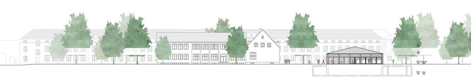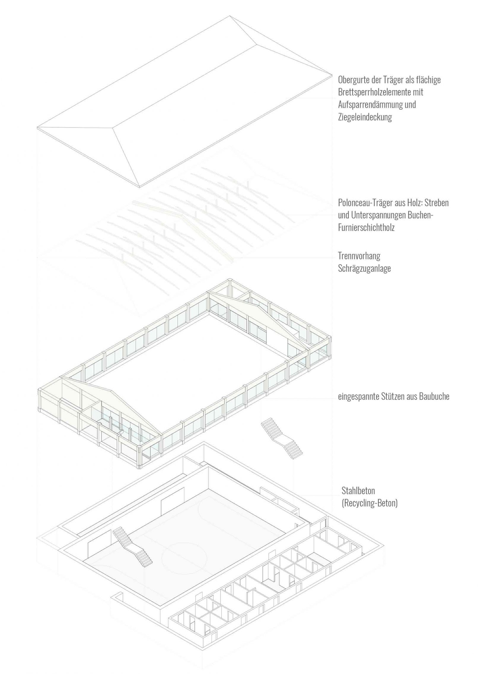 die teilabgesenkte einfachsporthalle ist teil der denkmalgeschützten reichshainschule und steht in unmittelbarer nähe bzw. im reichshainpark. die halle positioniert sich auf dem östlichen teil des grundstücks an der position der kürzlich abgebrochenen sporthalle. eingriffe in den baumbestand werden dadurch minimiert und gleichzeitig wird ein baulicher abschluss zum park hin erzeugt. prägend für die gestaltung des gebäudes ist mitunter die bestehende baumkulisse und die historischen gebäude der teichshainschule. die sporthalle ist teilabgesenkt, so dass oberirdisch lediglich der Luftraum der sporthalle sowie die zugangsbereiche in erscheinung treten. umkleiden und nebenräume sind unterirdisch verortet. das absenken des gesamten gebäudes bietet einige formale vorteile. so gliedert sich das gebäude pavillonartig in den umgebenden park ein. das oberirdisch sichtbare volumen passt sich der körnung der umgebung an. das gebäude öffnet sich auf der gesamten aussenseite und ermöglicht einen blick durch das gebäude hindurch auf das grün des parks und auf die historischen gebäude der reichshainschule, wodurch ein „schaufenster“ zum park entsteht. die umlaufend transparent gehaltene fassade erlaubt ebenerdige einblicke in die sporthalle und führt zu einer kommunikativen verbindung zwischen innen- und außenbereich. der oberirdische teil des gebäudes wird als holzbau errichtet. das dach wird mit ziegeln eingedeckt. die gewählte dachform nimmt Bezüge zur umgebungsbebauung auf und reagiert damit auf den historischen kontext und tritt in einen angemessenen dialog zur nachbarschaft.