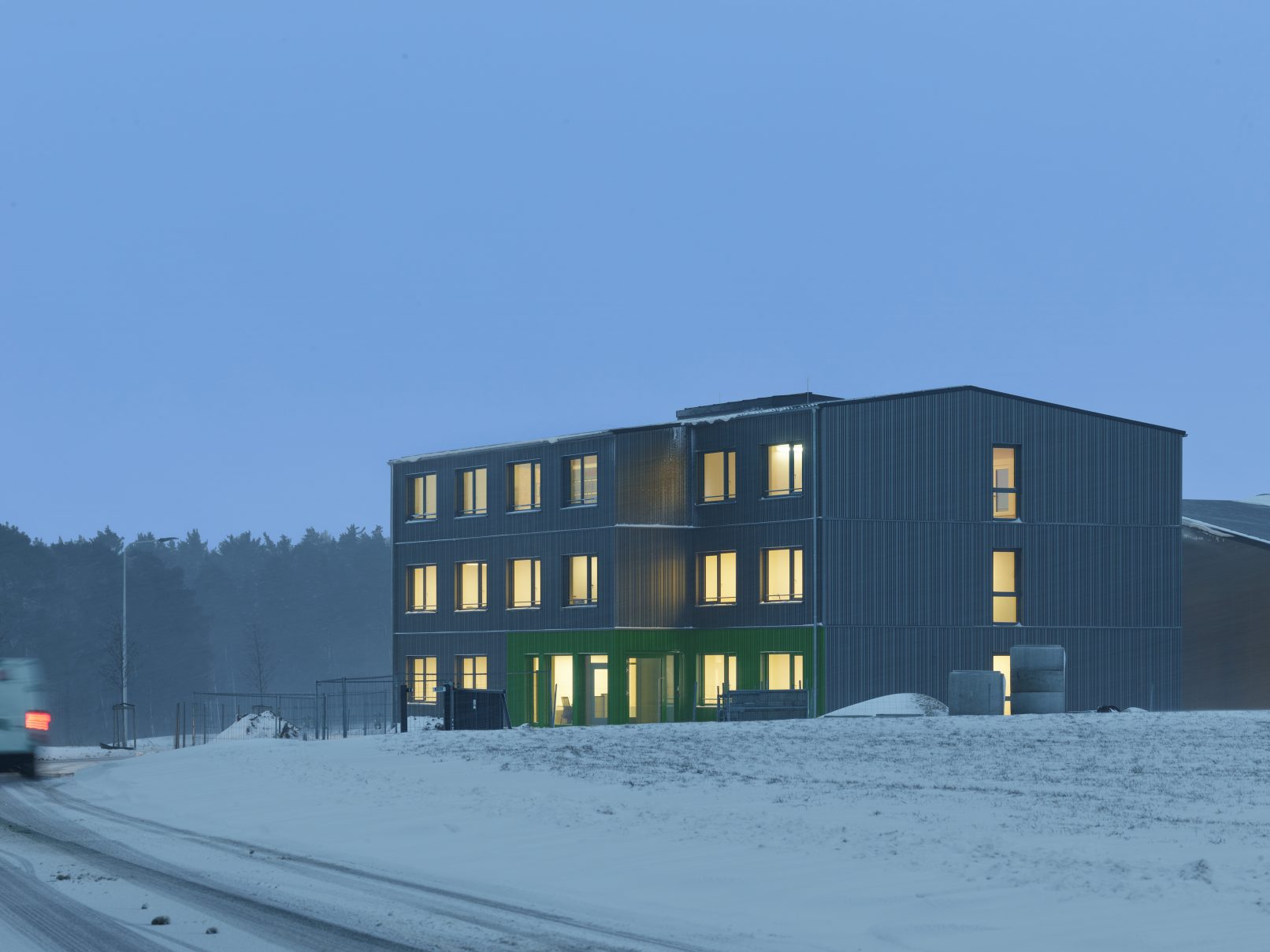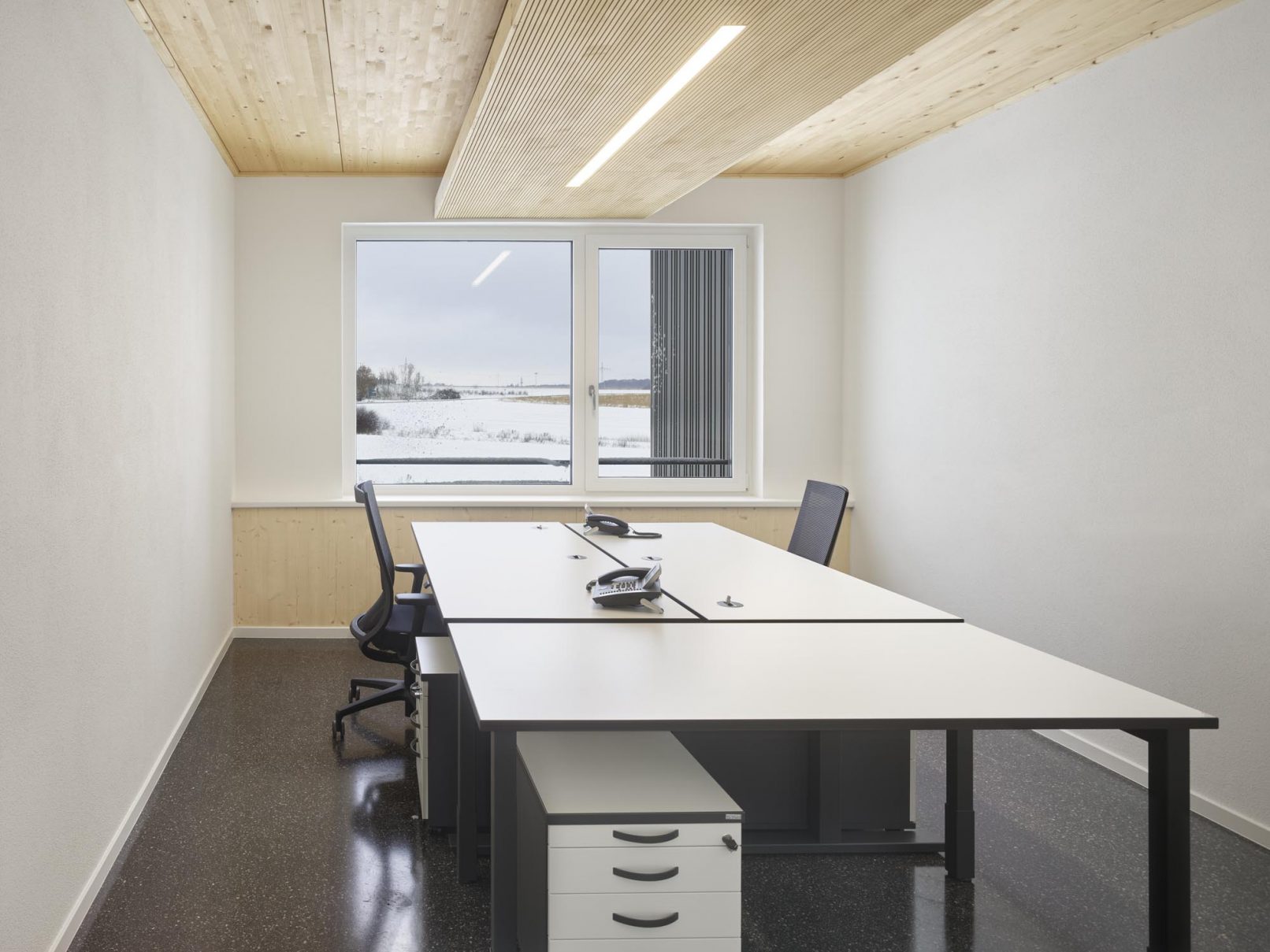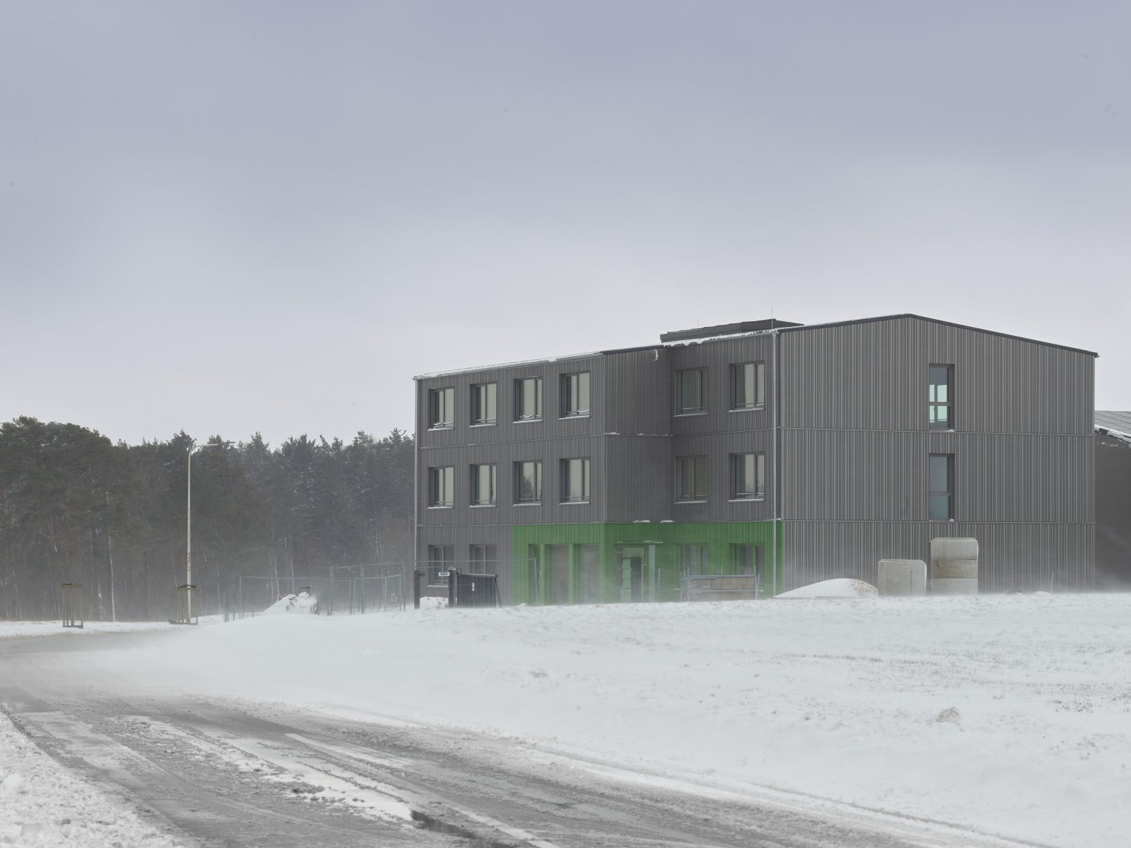 das als reiner holzbau gefertigte verwaltungsgebäude bildet den auftakt zum areal. der neubau ist in seiner form kompakt und effizient und fügt sich somit harmonisch in den städtebaulichen kontext ein. durch die kubische form mit flach geneigtem satteldach und ein gutes verhältnis von fassadenfläche zu volumen entsteht eine gebäudevolumetrie, die eine kosteneffiziente erstellung gewährleistet. der haupteingang befindet sich auf der ostseite und ist in der fassade gut ablesbar. der Empfang, der auch alssekretariat dient, ist an das zentrale treppenhaus angegliedert und öffnet sich zur strassenseite. über das treppenhaus wird der mehrzweckraum erschlossen sowie die bürobereiche im erdgeschoss und den obergeschossen. nebenräume sind an das treppenhaus angegliedert und zentral verortet. die klare gliederung des baukörpers in zwei ineinander geschobene nutzbereiche mit zentralem treppenhaus in der schnittstelle ist in der ausbildung des volumens ablesbar. eine firstverglasung im dach entlang des treppenhauses ermöglichen eine gute belichtung und belüftung des gebäudes. durch die innere gliederung des gebäudes können sanitär- und lüftungsinstallation zentral angeordnet werden. der verwaltungsbau ist als konstruktiver holzbau mit hohem vorfertigungsgrad konzipiert. die vorfertigung des holzbaus ermöglicht eine zügige errichtung des gebäudes. die aufgehende konstruktion des gebäudes besteht aus holzrahmenbauwänden. die decken sind als bsh-lamellendecken ausgeführt. die außenwände machen sich alle vorteile einer holzrahmenbaukonstruktion mit hinterlüfteter fassadenbekleidung zu eigen. farblich ist die metallschalung an die umliegenden gebäude angepasst.