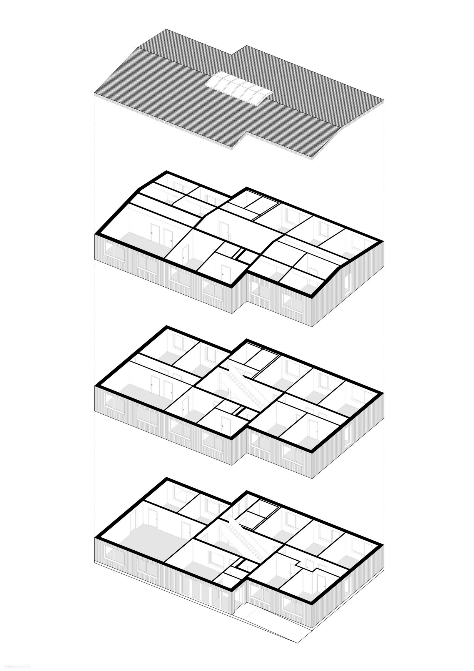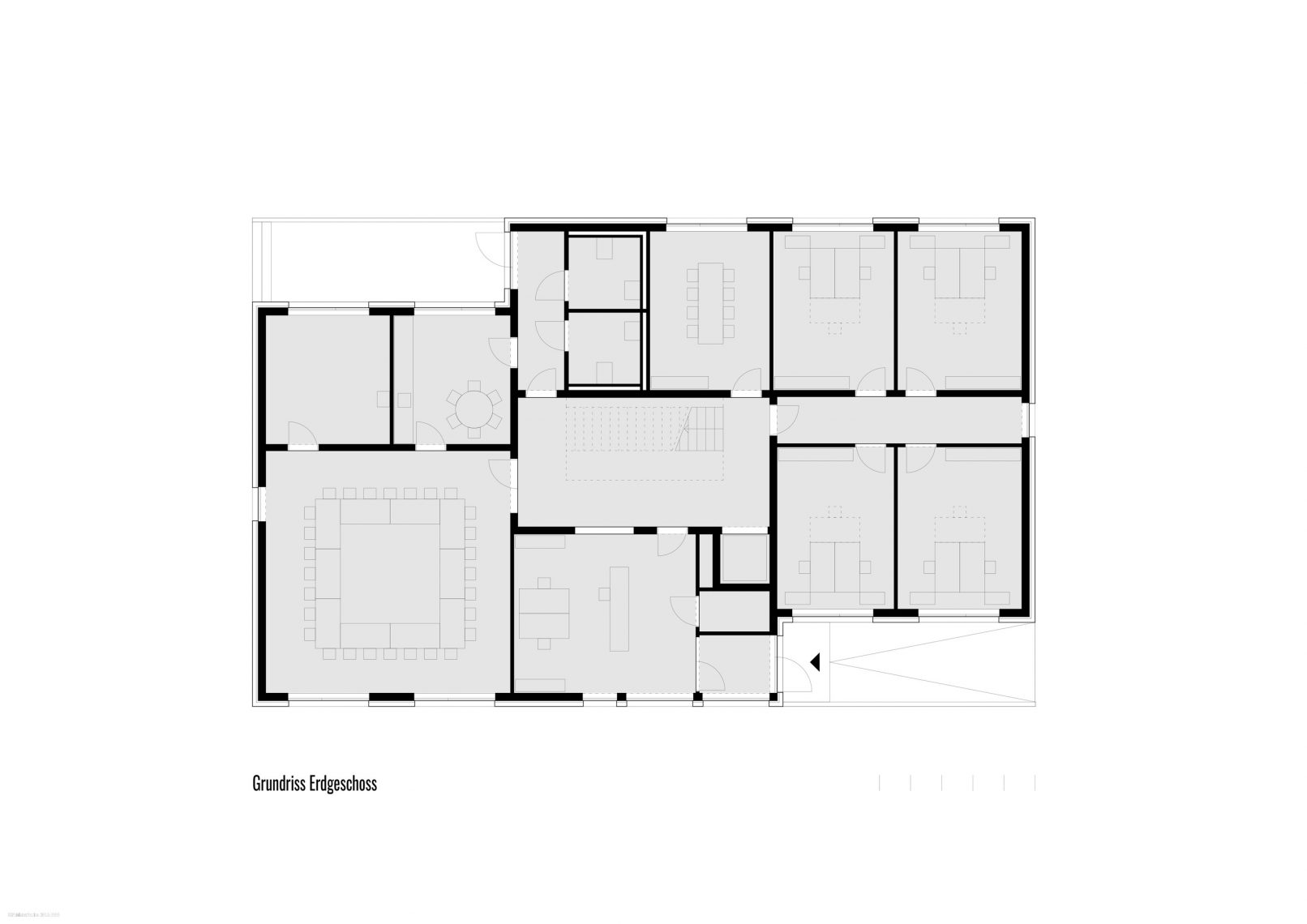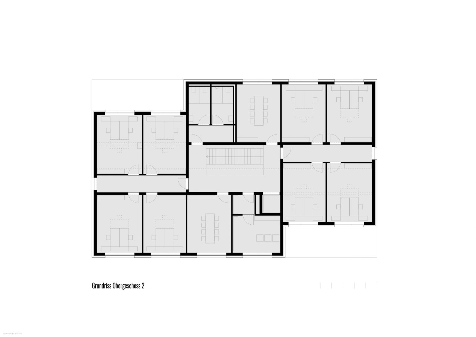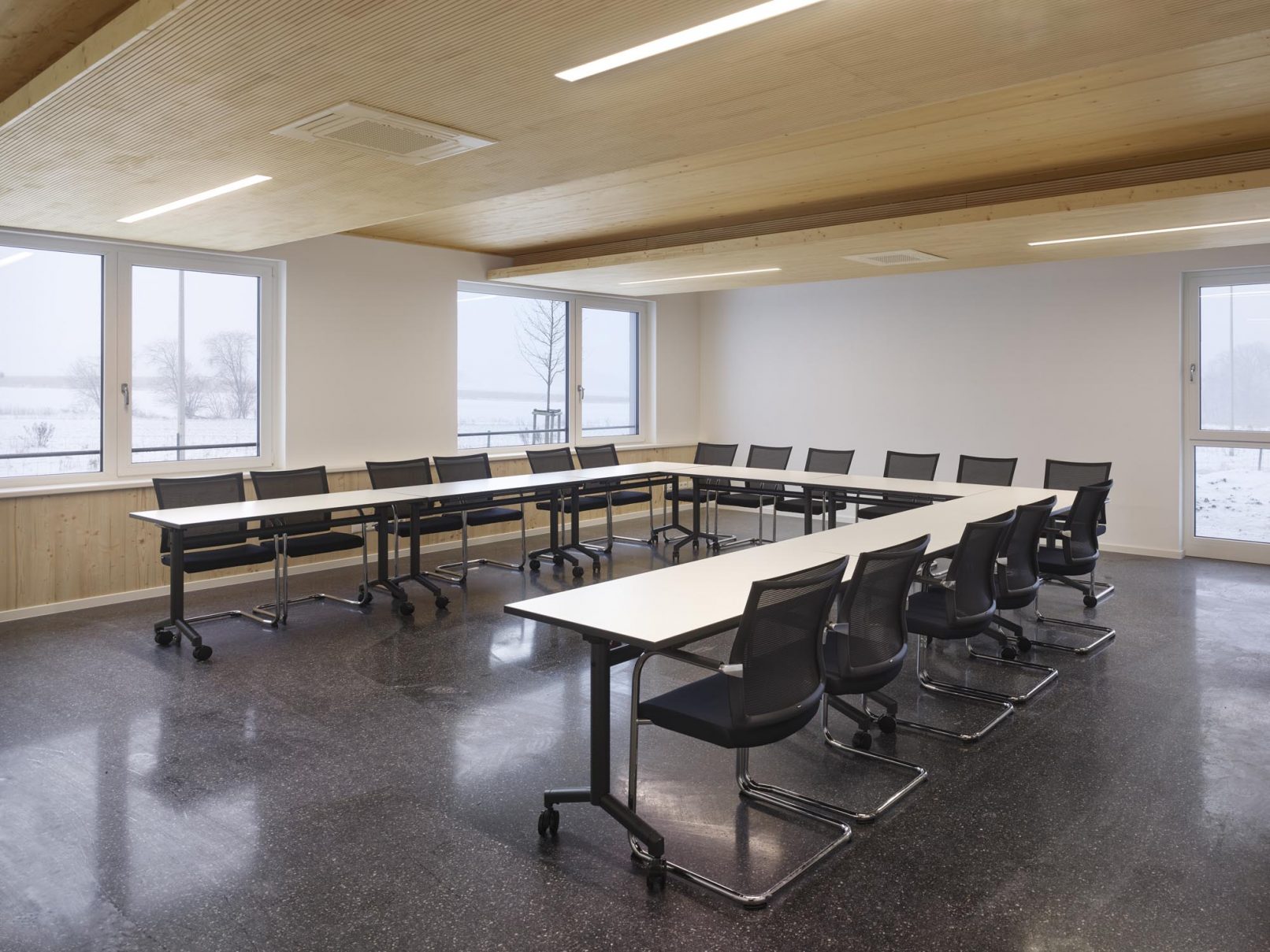 das als reiner holzbau gefertigte verwaltungsgebäude bildet den auftakt zum areal. der neubau ist in seiner form kompakt und effizient und fügt sich somit harmonisch in den städtebaulichen kontext ein. durch die kubische form mit flach geneigtem satteldach und ein gutes verhältnis von fassadenfläche zu volumen entsteht eine gebäudevolumetrie, die eine kosteneffiziente erstellung gewährleistet. der haupteingang befindet sich auf der ostseite und ist in der fassade gut ablesbar. der Empfang, der auch alssekretariat dient, ist an das zentrale treppenhaus angegliedert und öffnet sich zur strassenseite. über das treppenhaus wird der mehrzweckraum erschlossen sowie die bürobereiche im erdgeschoss und den obergeschossen. nebenräume sind an das treppenhaus angegliedert und zentral verortet. die klare gliederung des baukörpers in zwei ineinander geschobene nutzbereiche mit zentralem treppenhaus in der schnittstelle ist in der ausbildung des volumens ablesbar. eine firstverglasung im dach entlang des treppenhauses ermöglichen eine gute belichtung und belüftung des gebäudes. durch die innere gliederung des gebäudes können sanitär- und lüftungsinstallation zentral angeordnet werden. der verwaltungsbau ist als konstruktiver holzbau mit hohem vorfertigungsgrad konzipiert. die vorfertigung des holzbaus ermöglicht eine zügige errichtung des gebäudes. die aufgehende konstruktion des gebäudes besteht aus holzrahmenbauwänden. die decken sind als bsh-lamellendecken ausgeführt. die außenwände machen sich alle vorteile einer holzrahmenbaukonstruktion mit hinterlüfteter fassadenbekleidung zu eigen. farblich ist die metallschalung an die umliegenden gebäude angepasst.