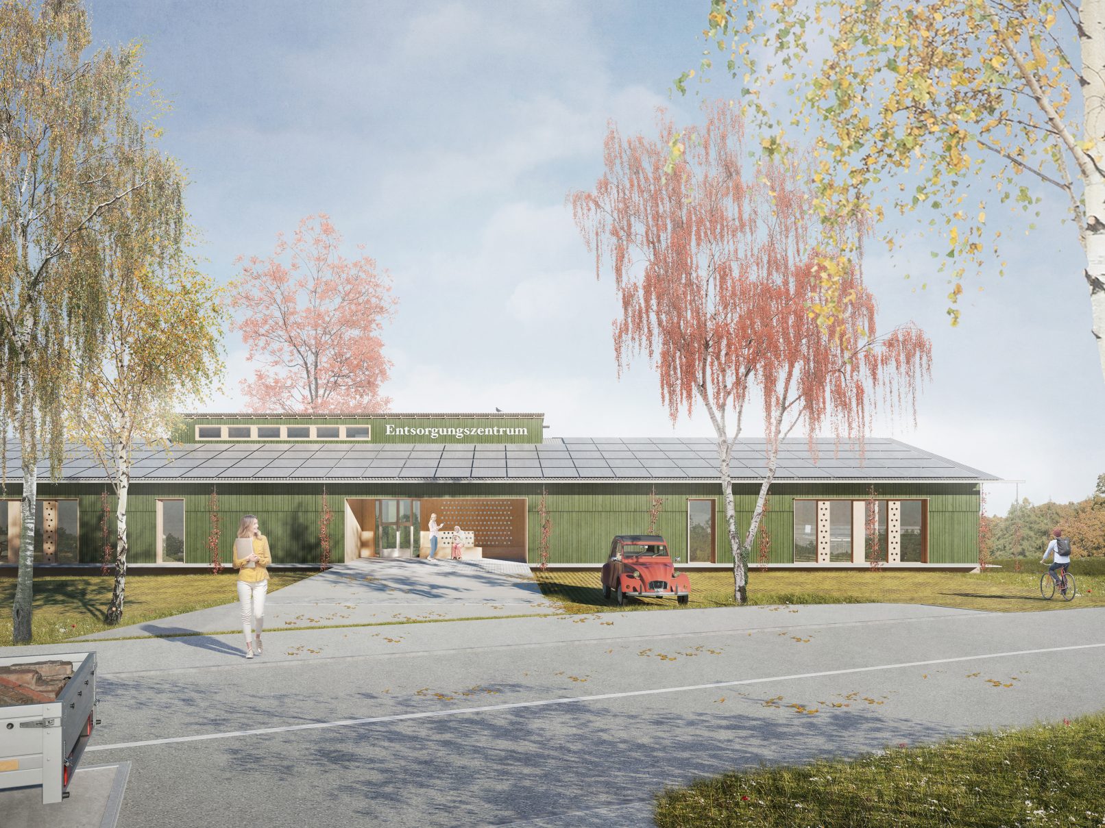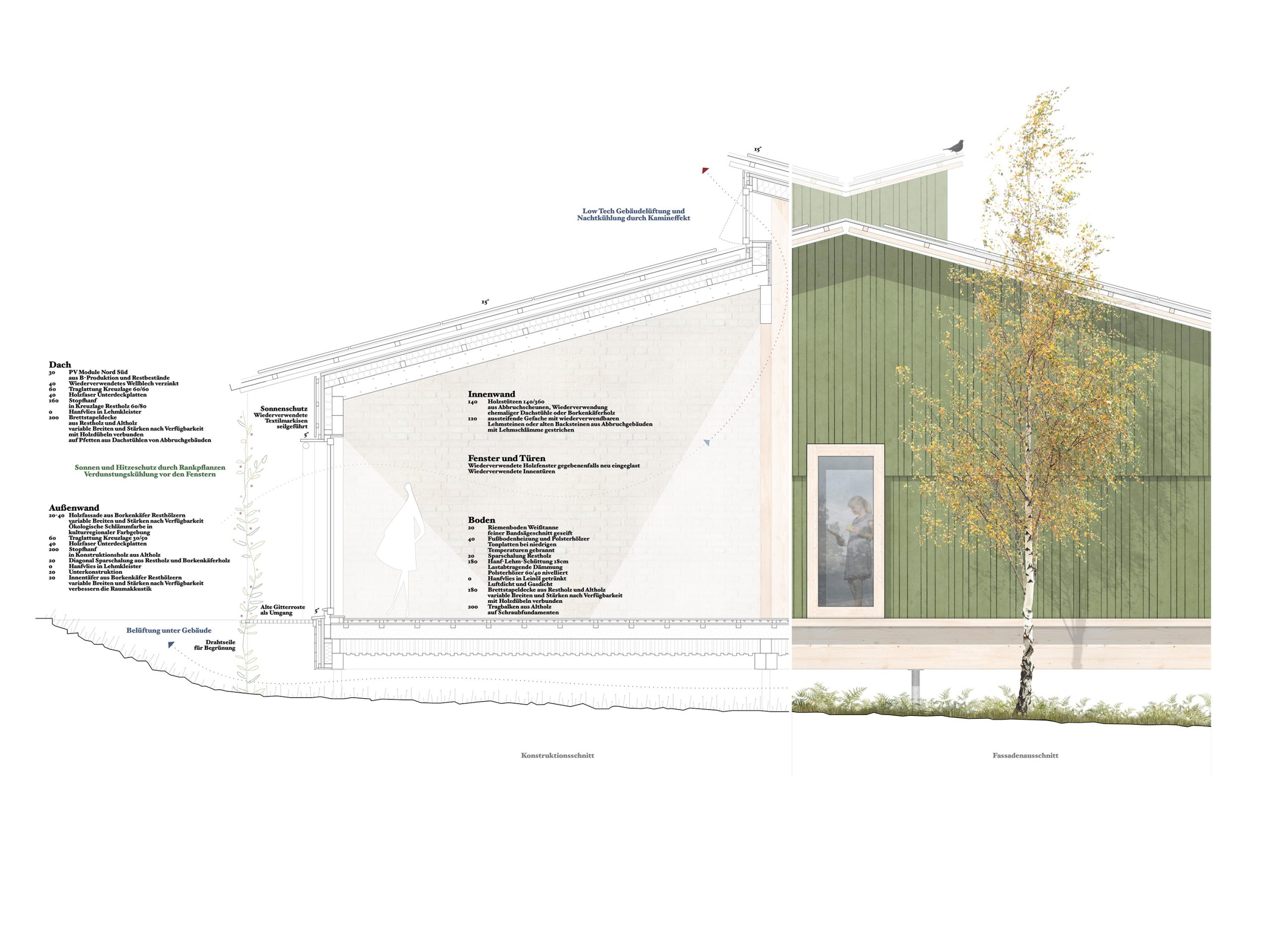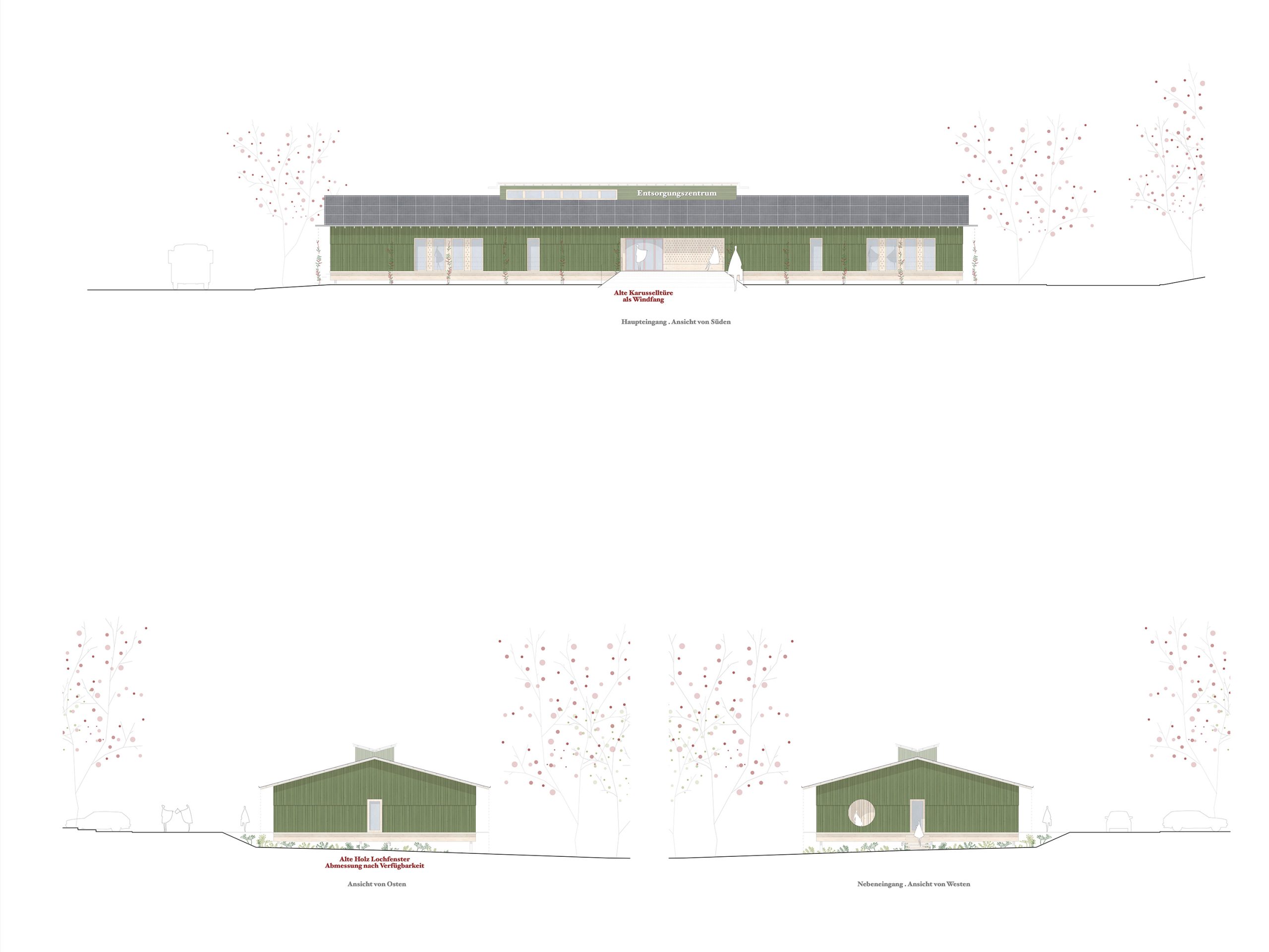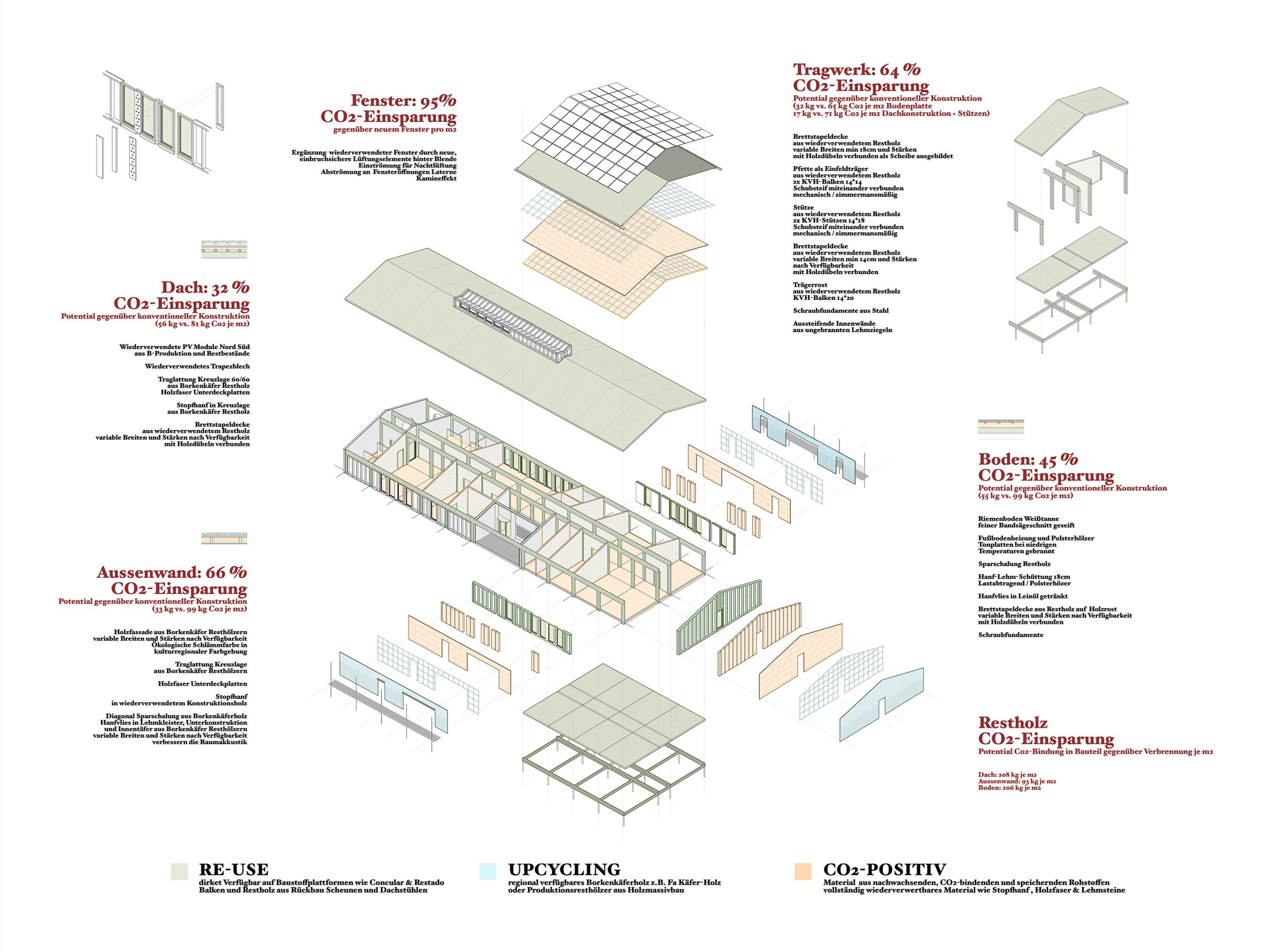 unser entwurf für das neue verwaltungsgebäude des entsorgungszentrums heilbronn basiert auf den prinzipien des klima- und kreislaufgerechten bauens. das gebäude ist zement- und leimfrei konzipiert und nutzt eine einfach aufgebaute holzskelettkonstruktion aus wiederverwendeten holzbalken aus alten scheunen und dachstühlen als grundlage. der einsatz von resthölzern aus kalamitätsholz, ungebrannten lehmsteinen und stopfhanf ergänzen das nachhaltige konzept. alle bauteile sind sortenrein rückbaubar und ermöglichen eine vollständige rückführung in den stoffkreislauf.