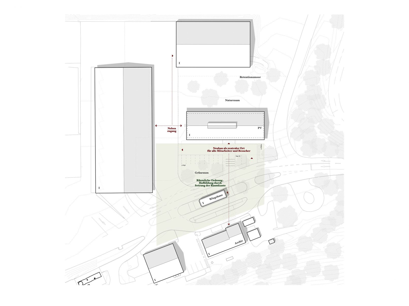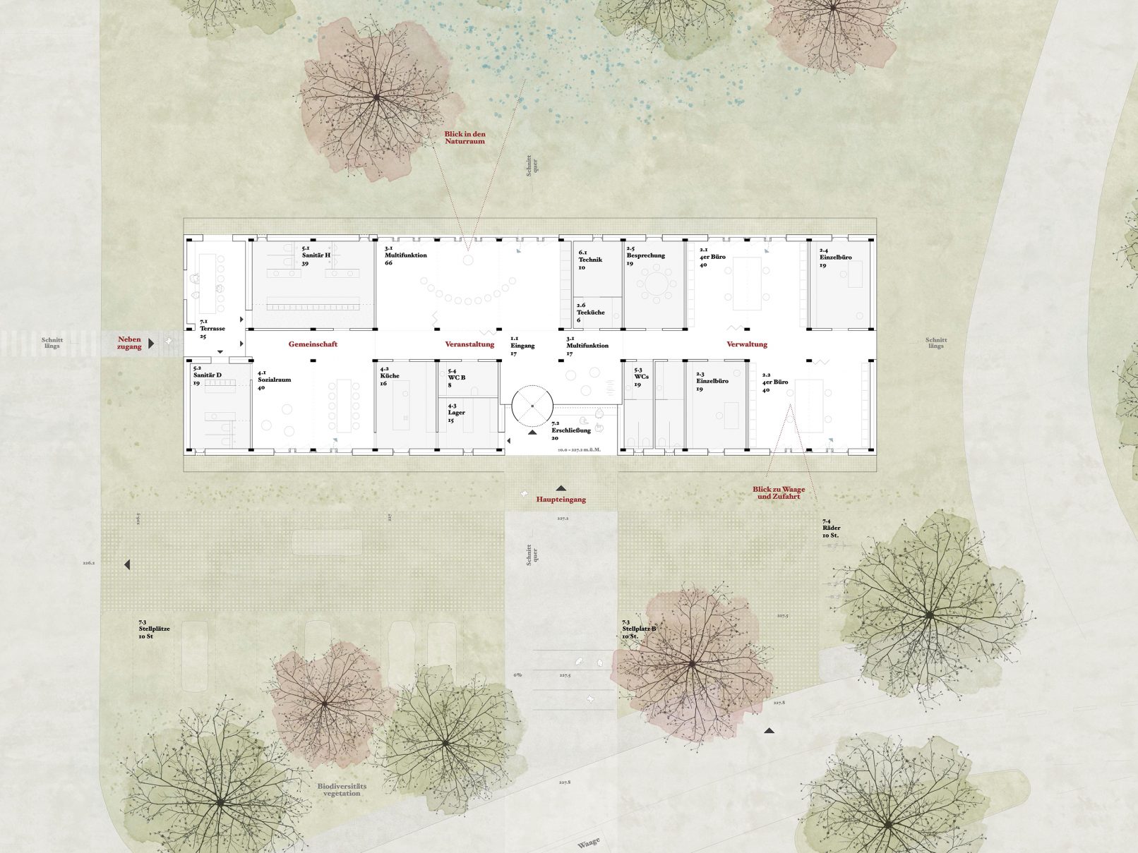 das innere erschließungskonzept überzeugt durch klarheit und orientierung. die abfolge von offenen und geschlossen gestalteten raumgruppen erzeugt trotz der längsentwicklung eine großzügige raumwahrnehmung. der entwurf vereint ökologische verantwortung, funktionale effizienz und zirkuläres bauen zu einer zukunftsorientierten verwaltungsarchitektur.