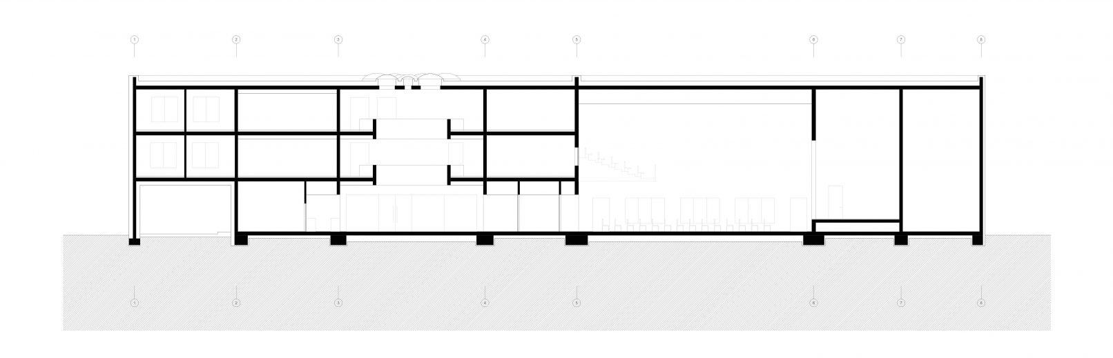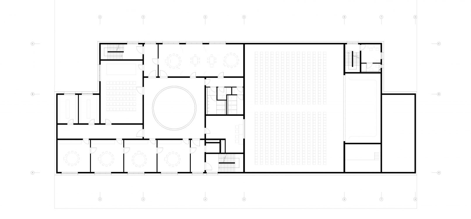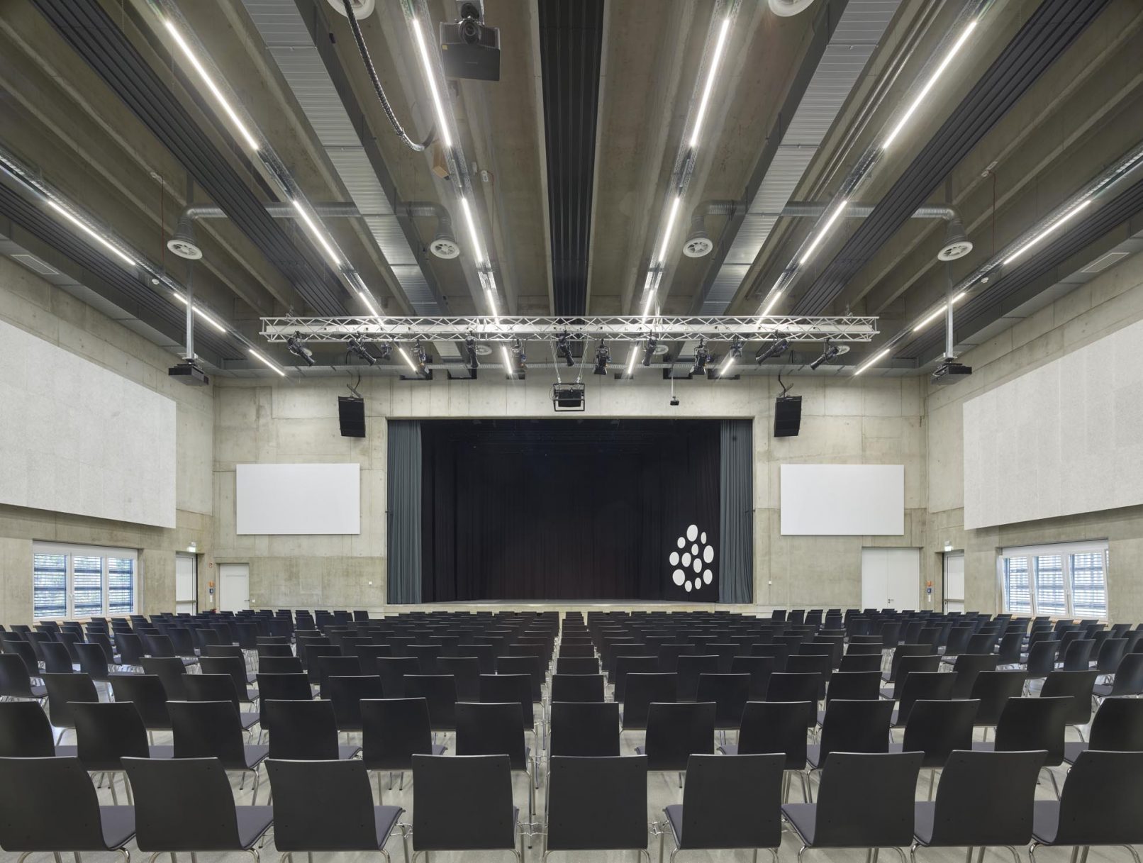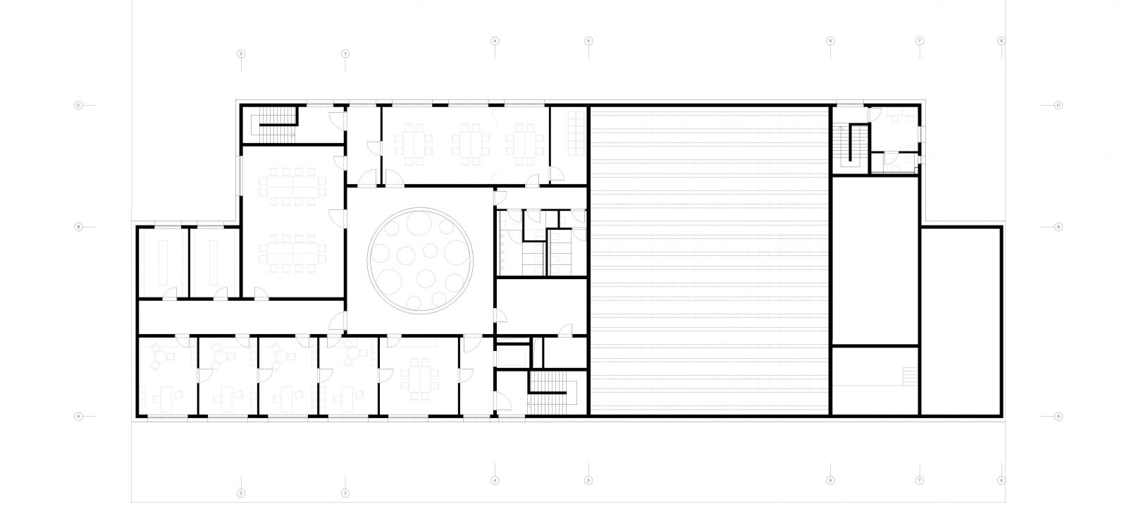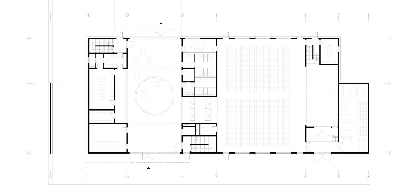 der gemeindeneubau (modul 1), ein kompakter, einheitlicher baukörper, konsequent orientiert zu marie-curie-strasse, auf strassenebene transparent und einladend, in seiner gesamtheit nüchtern und funktional. der gemeinschaftsbereich ist organisiert auf 3 ebenen, welche über das zentrale atrium räumlich miteinander verwoben sind. dieses liefert natürliches Licht, gewährleistet eine effiziente natürliche belüftung des baukörpers, bietet raum für kommunikation, aufenthalt und spiel und stellt somit das herzstück des ge- meindelebens dar. der saalkomplex hingegen ist linear angeordnet, angegliedert an das grosszügige foyer, welches auch die verbindung zum gemeinschaftsbereich bildet. dieses ermöglicht multifunktionale räumliche abfolgen, bei denen ein hohes personenaufkommen kompensiert werden muss. der saalkomplex wird im osten durch einen technikriegel mit bühne ergänzt, um die logistischen abläufe der lagerräume, technik und anlieferung zu optimieren.